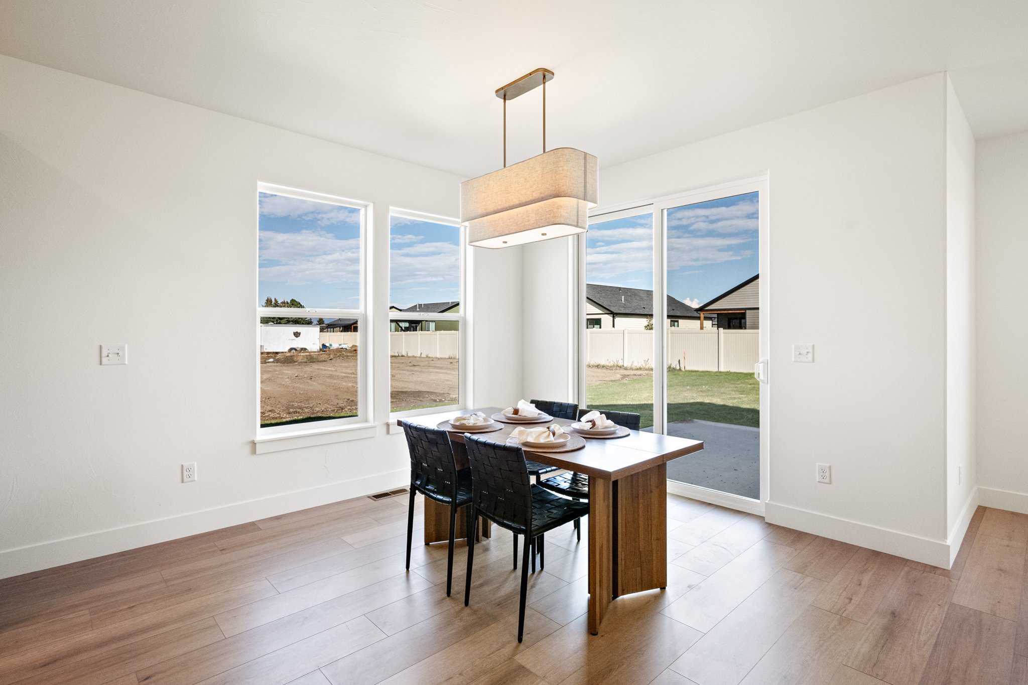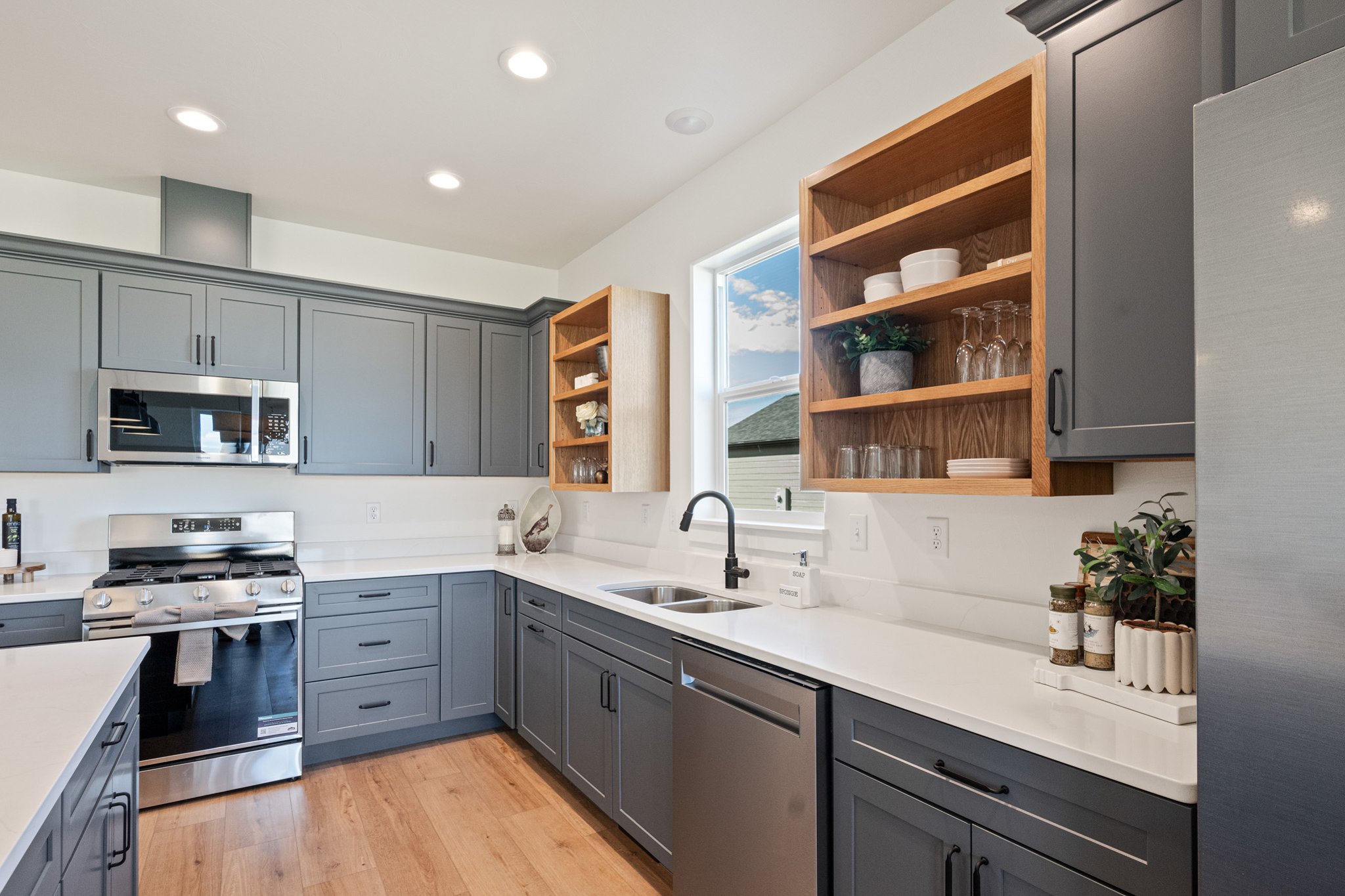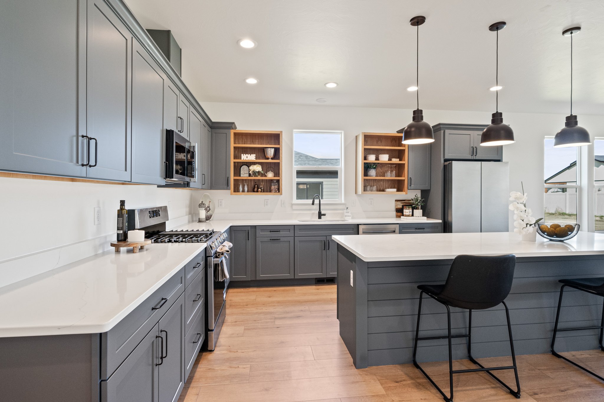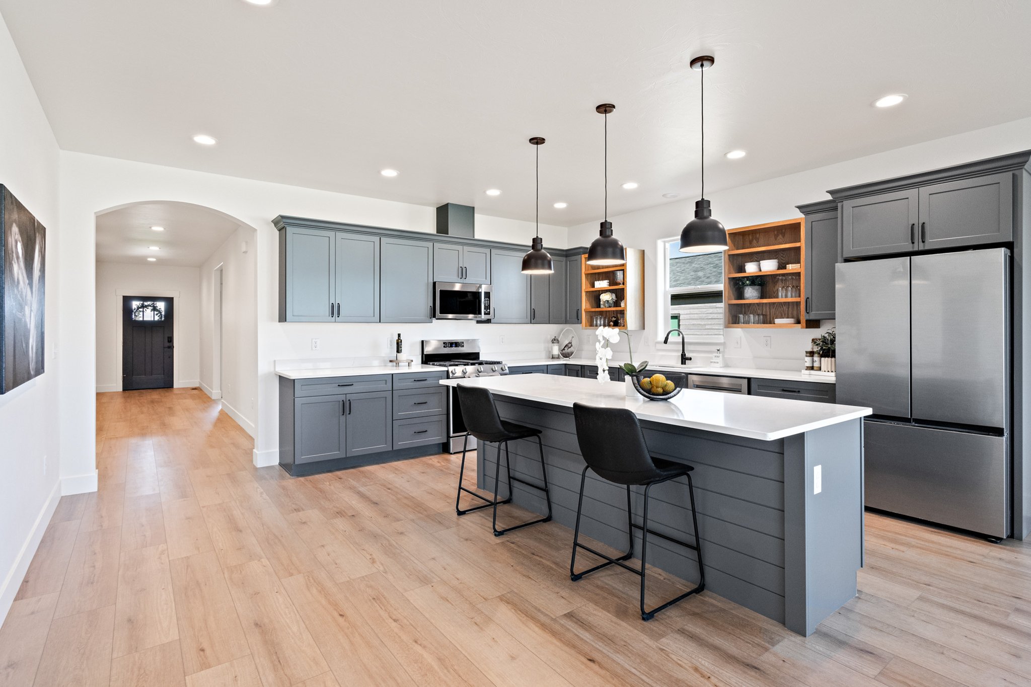 Nestled in a beautiful new subdivision adjacent to both the elementary and high school, this stunning 2,182 square foot spec home offers a perfect blend of modern design and functional living. As you enter, you’re welcomed by a thoughtfully designed entryway featuring a built-in cubby and bench, ideal for storing shoes and bags. The open floor plan seamlessly connects the inviting living room, complete with a cozy gas fireplace, to the enlarged kitchen, boasting ample cabinet storage and elegant grey cabinetry paired with stylish wood open shelving. This home features four spacious bedrooms and two well-appointed bathrooms, including a luxurious master suite with both a walk-in shower and a freestanding tub for ultimate relaxation. Imagine living in this beautiful space, where every detail has been carefully crafted for comfort and style, making it the perfect place to create lasting memories.