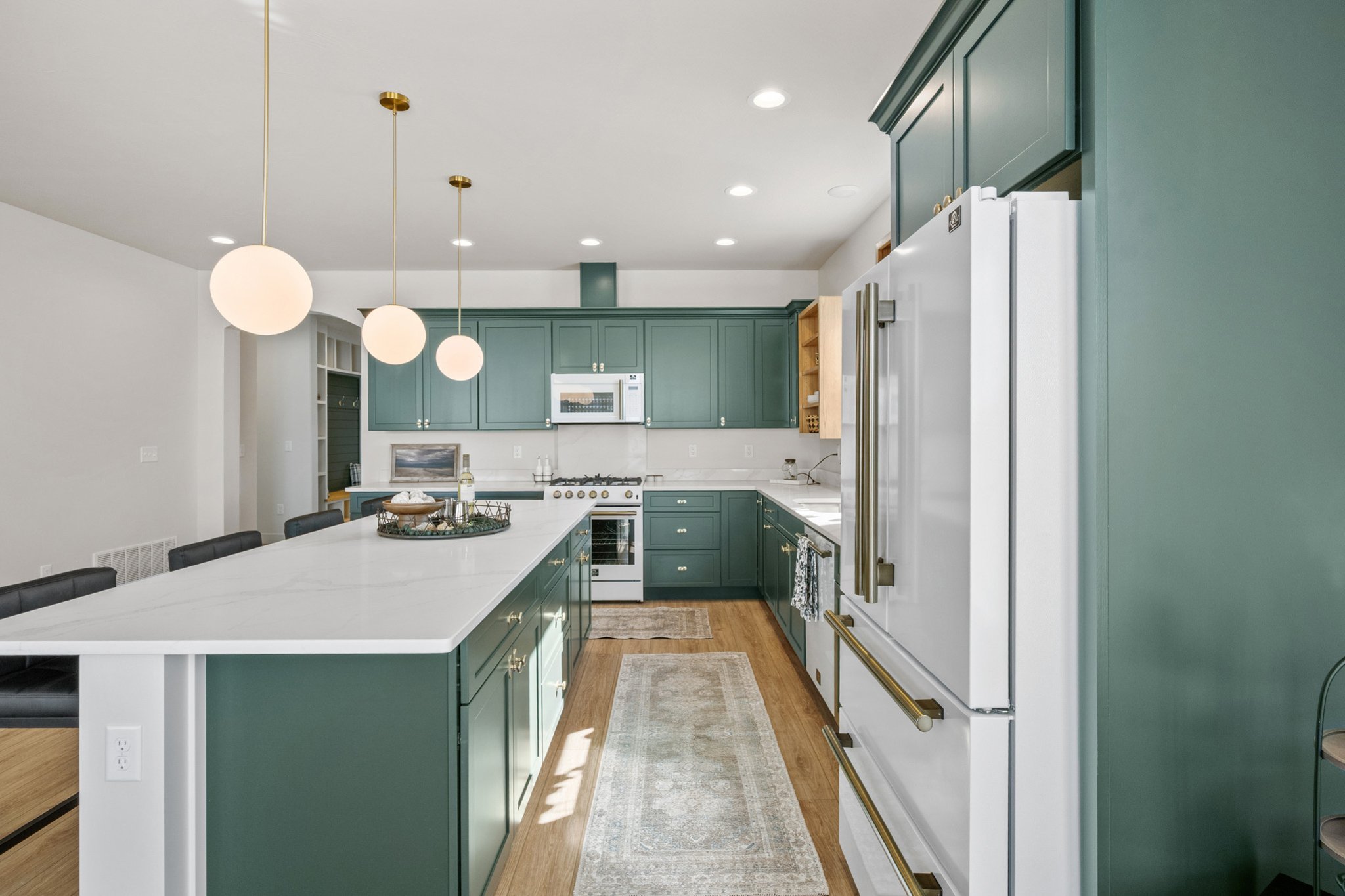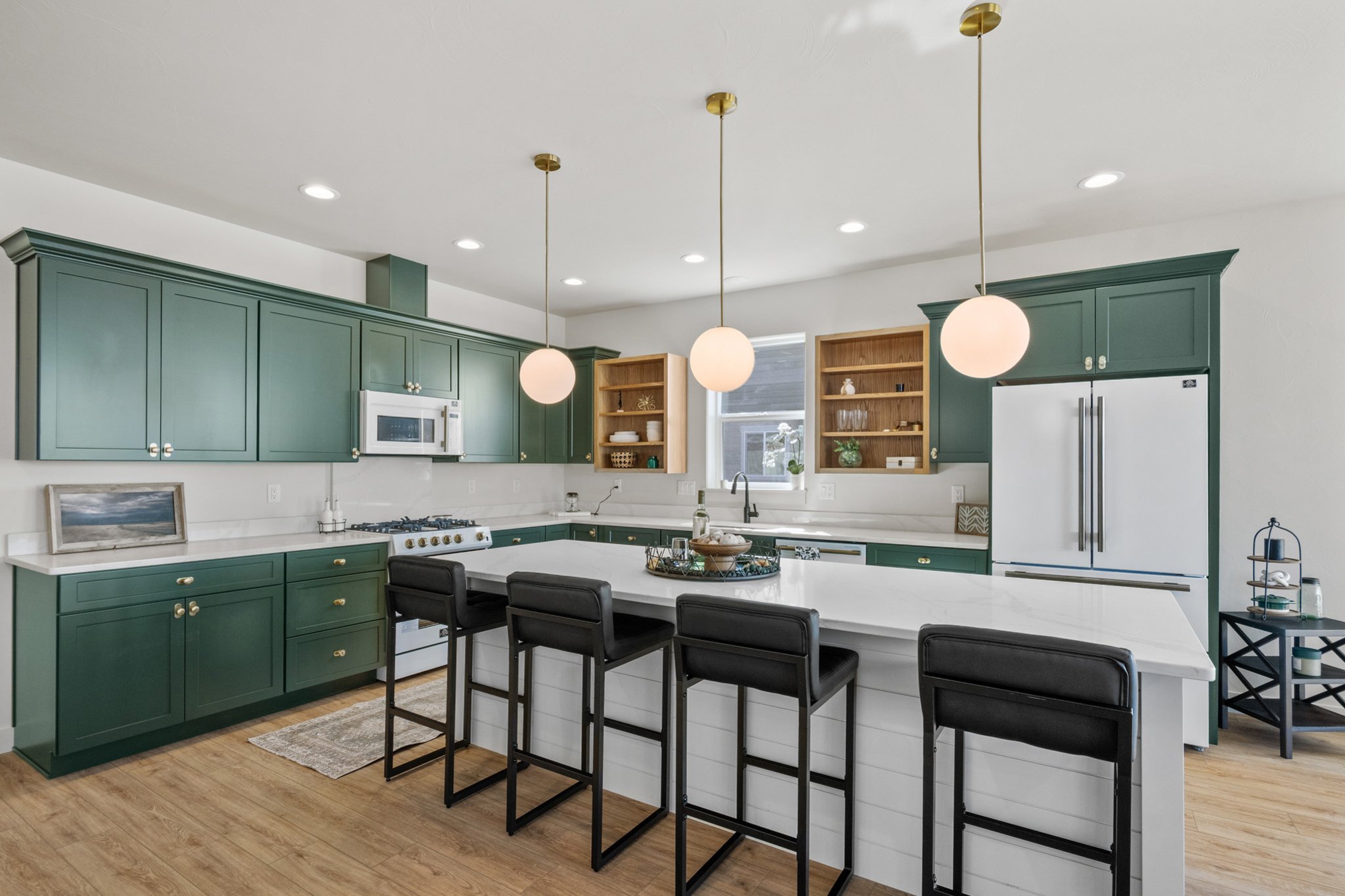 At the heart of the home, a stunning tile fireplace creates a warm and inviting living space—perfect for gathering with family and friends. The kitchen is equally impressive, featuring rich forest green cabinetry paired with antique hardware, creating a timeless and distinctive aesthetic.